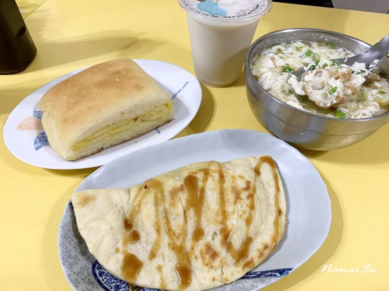 這天我們點了一份烤蛋餅、鹹豆漿、奶酥饅頭、冰豆漿,還外帶一個韭菜盒子,全部加起來百元有找,真是佛心又吃得飽的價格。