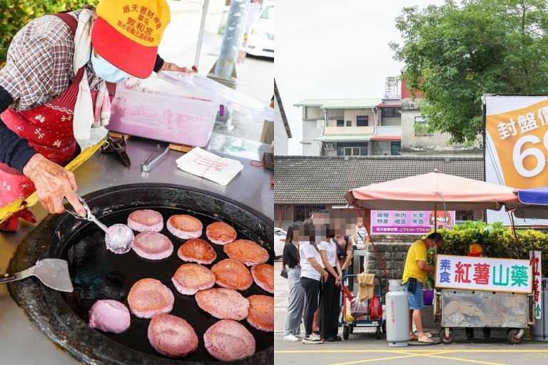 會知道《草屯李蘇古早味紅薯餅》是因為綜藝玩很大六週年企劃,鬼哥和KID來幫阿嬤做紅薯泥,當時就把《李蘇古早味紅薯餅》列入草屯口袋名單,據說阿嬤在這裡賣23年,小小攤車靠著阿嬤雙手,一塊一塊慢慢煎,由於都是阿嬤一人作業,想吃的朋友請耐心等候唷!