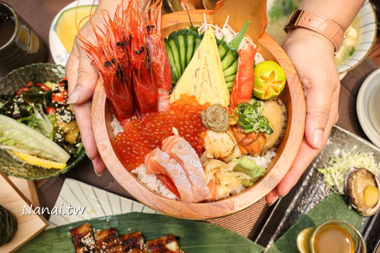 最具人氣的極蝦海膽鮭魚卵丼飯,端上來那誇張的畫面,快滿出木盆的視覺感,令人驚嘆聲四起,尤其是鋪排開來日本鮭魚卵、日本北海道海膽、鮑魚、蟹肉、蝦膏、宜蘭龜山島胭脂蝦、鮭魚生魚片、玉子燒日式煎蛋、北海道生干貝,底層再鋪上一層丼飯,大滿貫等級十分澎湃,是老饕就懂得點這道,而且它還是限量販售,想吃千萬要提前預訂,避免撲空阿~