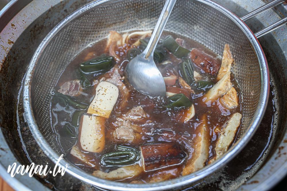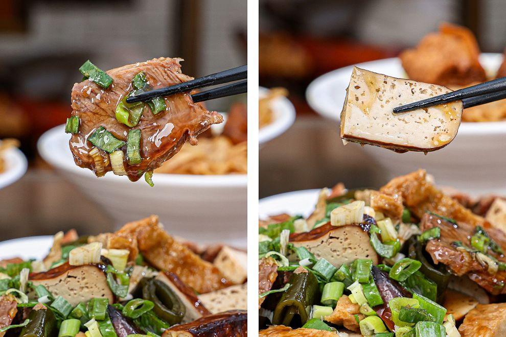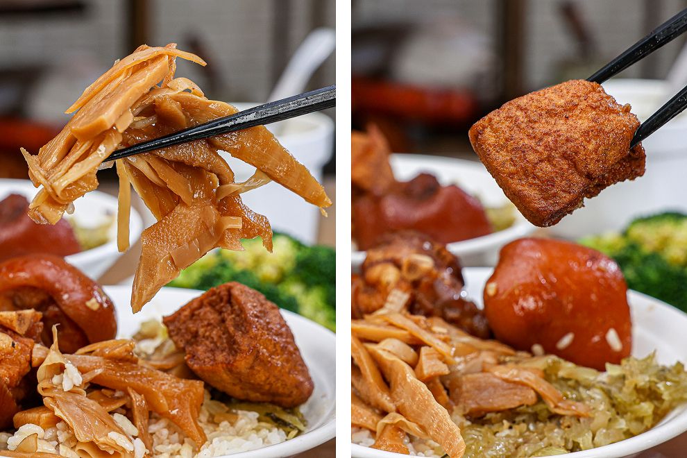 筍乾滷得入味,時間的燉煮讓醬香完全滲透進每一絲纖維中,吃起來鹹香甘醇;油豆腐則是選用嫩豆腐,它的外皮不會老,裡頭保有嫩度,好吃~