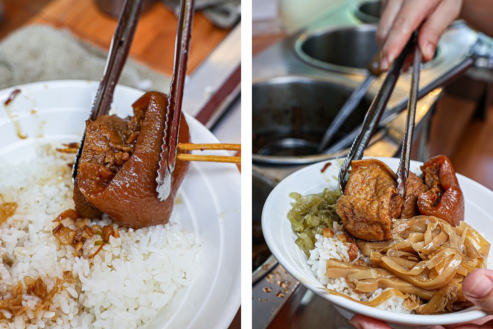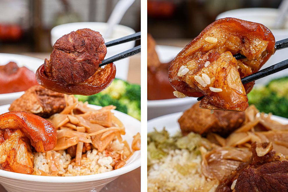 豬腳飯是店裡人氣王!選用台灣豬肉細火慢燉,滷汁鹹香濃郁卻不會過鹹,豬腳外皮帶著微Q膠質,不會軟爛。裡面的肉肥瘦適中,咬起來有彈性、不柴也沒有腥味。配料有油豆腐、筍乾與酸菜,一口肉一口飯吃得好滿足。
