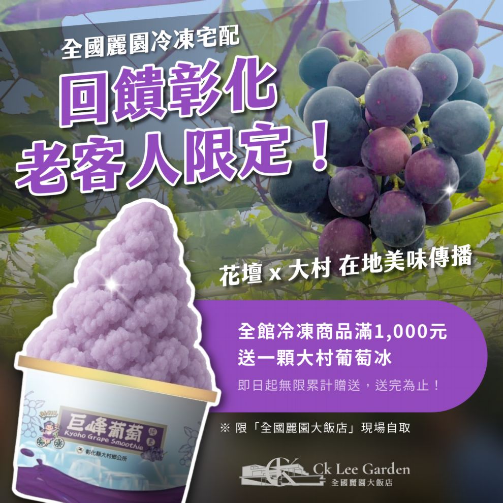全館冷凍商品滿1,000元,送一顆大村葡萄冰,送完為止,限全國麗園大飯店現場自取!