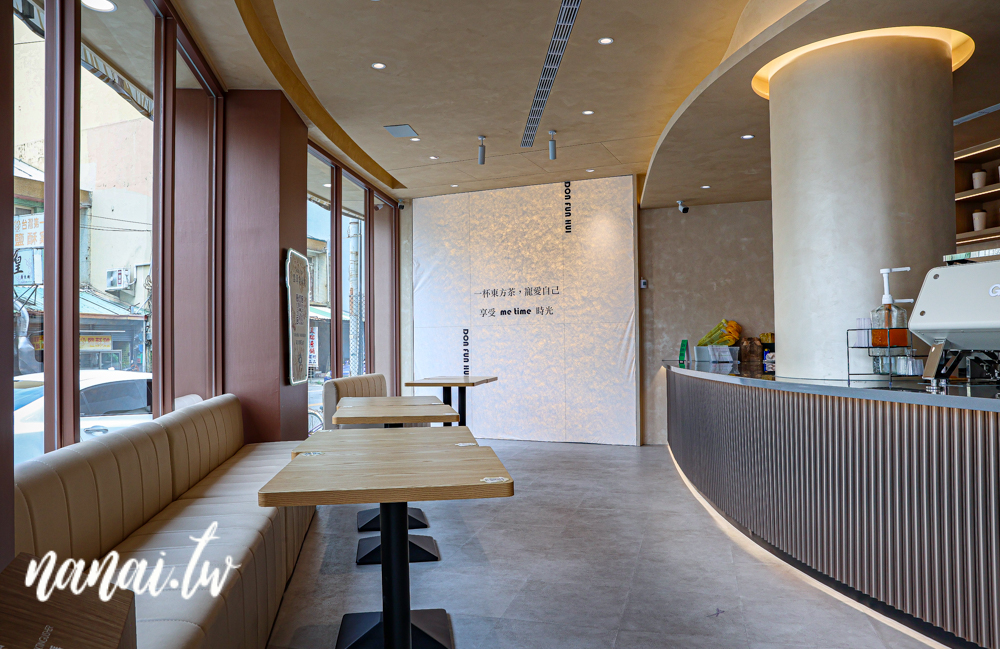 推開門的瞬間,仿佛走進一座低調奢華的茶飲殿堂!圓弧造型的飲料吧檯宛如水波般延伸開來,格柵線條細緻有序,搭配特殊奶茶色清水模塗料,讓空間感柔和又氣派,完全打破一般對茶飲店的想像。
