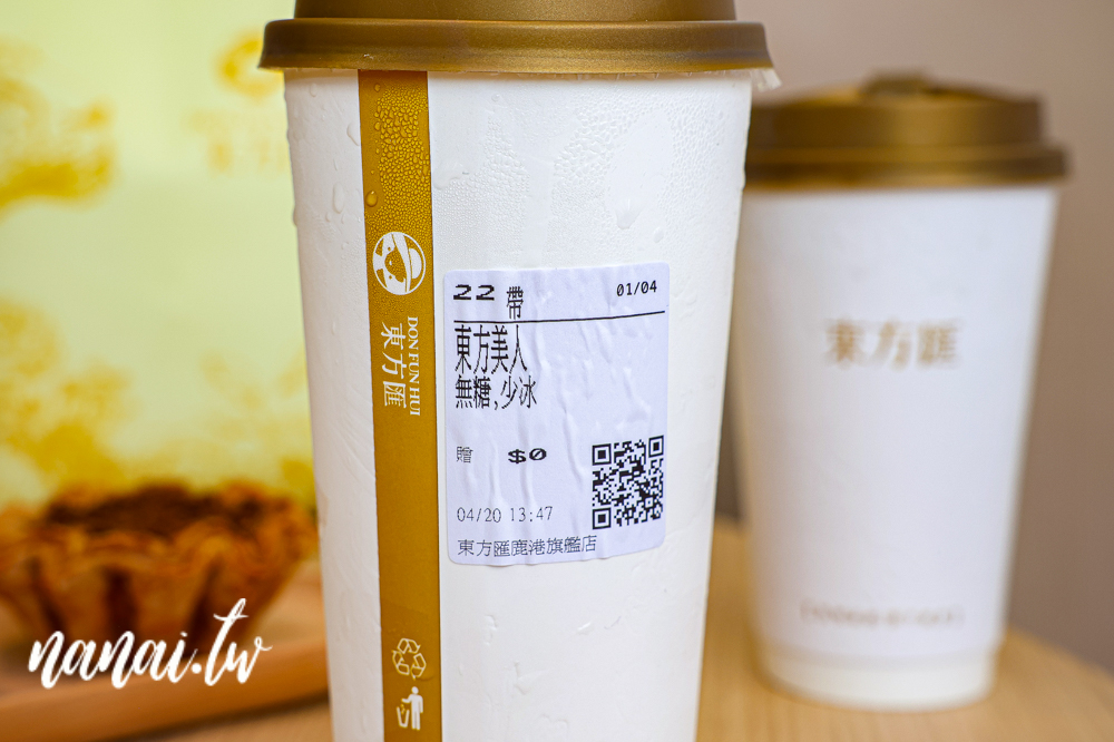 平常就很喜歡喝茶,看到這款東方美人是選用新竹北埔比賽茶,立刻被吸引點了一杯。我選擇無糖,第一口有著飽滿的蜜香在舌尖綻放,隨著唾液交融,還帶出淡淡的花果香氣,尾韻清爽纖細,還有回甘滋味,完全沒有發酵過頭的那種重味道,這杯真的讓人一喝就愛上。