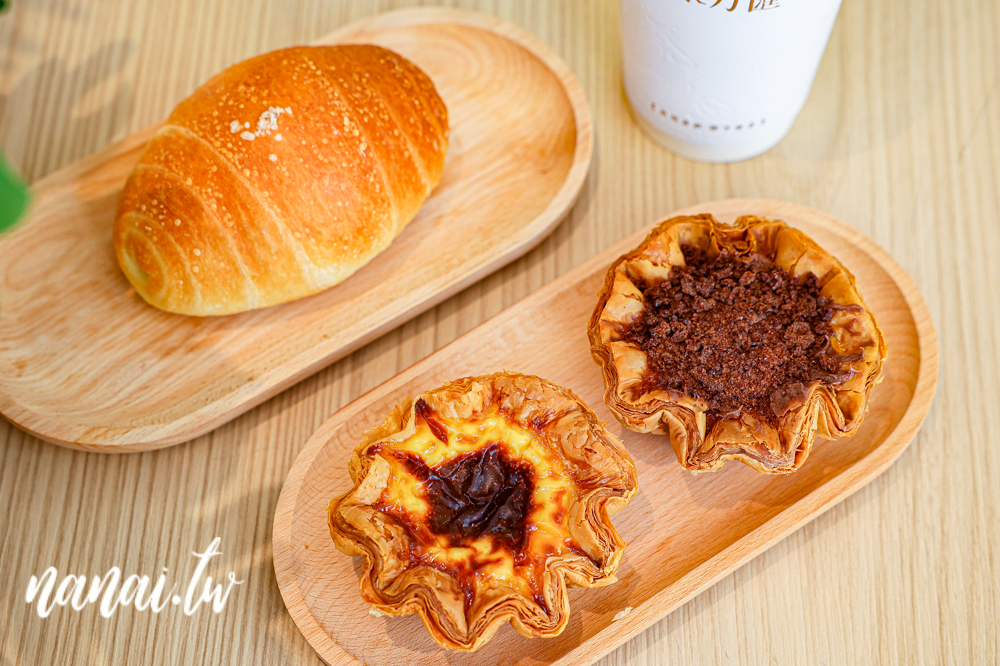 甜點會不定期推出新品,這天看到的品項有布列塔尼可頌、夢中蘋果派、核桃肉桂捲、法式鹽可頌、厚燒金磚(巧克力/花生)、殿堂級法式焦糖蛋塔、脆酷力蛋塔,每一款甜點都選用了法國奶油製作,完全不輸給名店,價格大約都在百元以內。