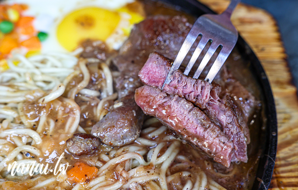 鐵板麵的份量也毫不手軟,麵體吸附著綜合醬汁,每一口吃起來Q彈有勁,不會太軟爛,根根都好入味。