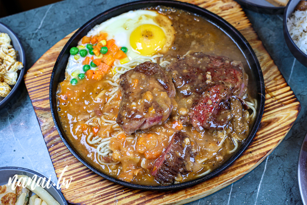 如果不想吃火鍋,這裡也有排餐可選。我們點了250元菲力牛排,鐵盤一上桌熱煙直竄,滋滋作響聲音在耳邊傳開,盤上躺著兩塊菲力牛排,厚度還算實在,大約七分熟,肉質軟嫩恰好,口感軟嫩恰好,咬起來不會卡牙。旁邊還有荷包蛋與三色豆點綴,最後淋上店家特製綜合醬,黑胡椒的辛香與蘑菇醬濃郁相互交融,鹹香帶點微辣,整體表現很不錯。
