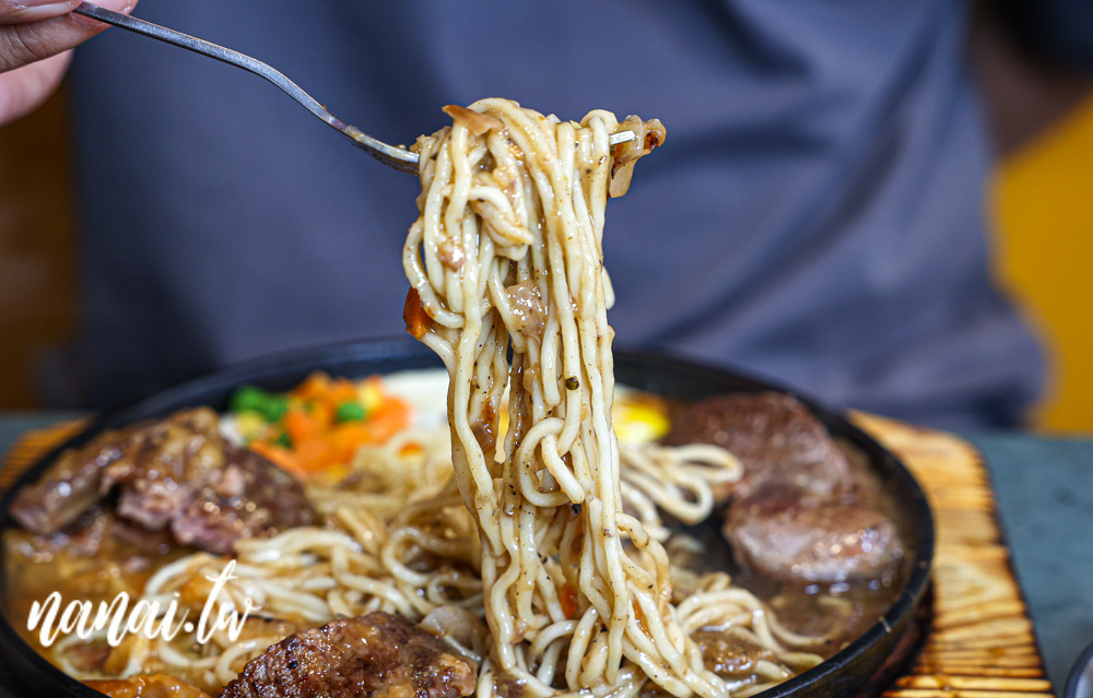 鐵板麵的份量也毫不手軟,麵體吸附著綜合醬汁,每一口吃起來Q彈有勁,不會太軟爛,根根都好入味。