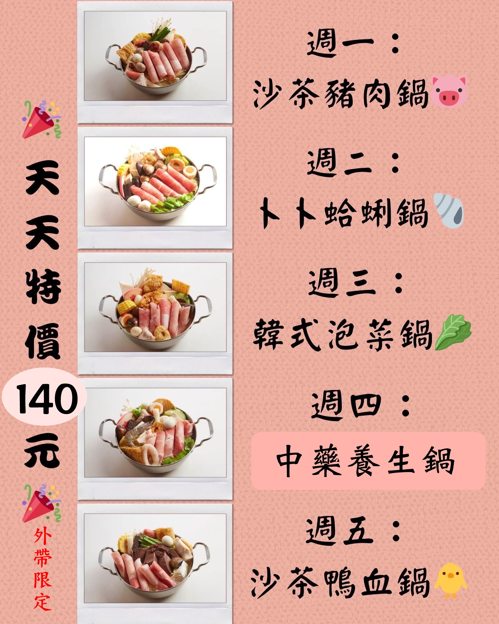 哇!勁爆的來囉!老闆佛心大放送,推出一個月限定外帶活動,週一~週五外帶限定鍋物優惠,每鍋只要140元,這價格真的錯過會捶心肝!