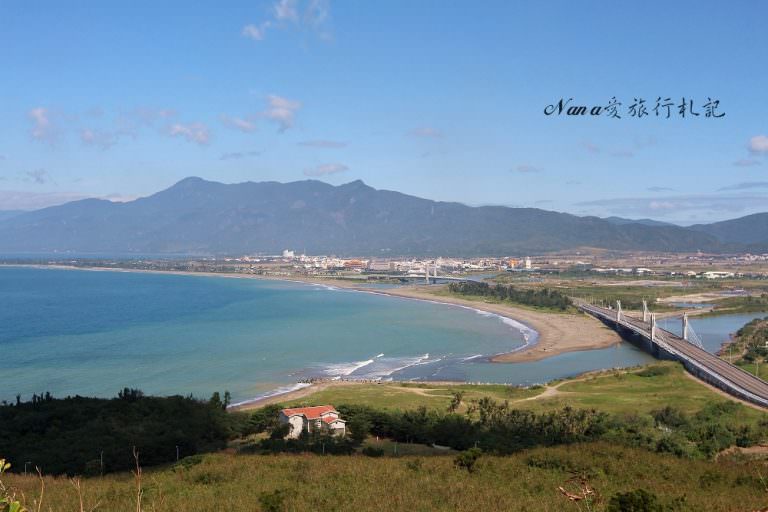 當你抵達聽濤坪時,眼前美景十分震撼,天阿~這一幕也太漂亮了啦!! 藍天白雲的天空、壯觀山巒,還有月亮形狀的的海岸線、白色的雙斜張橋,實在是美到不要不要的,站在這裡大口的呼吸,超級舒服的拉!