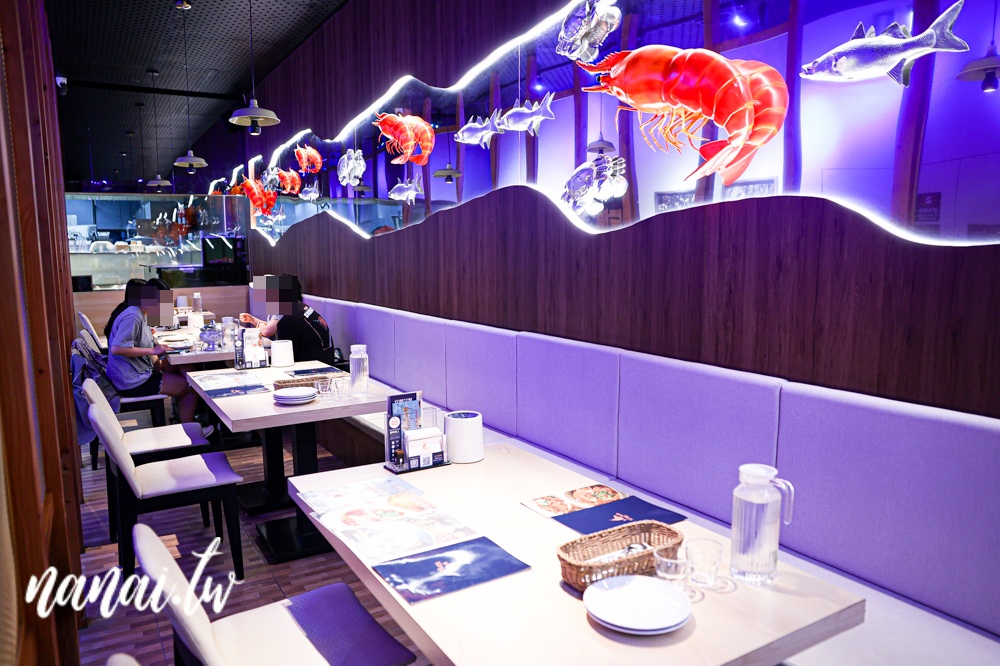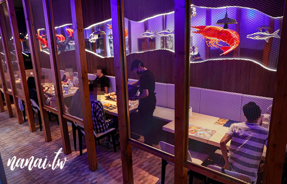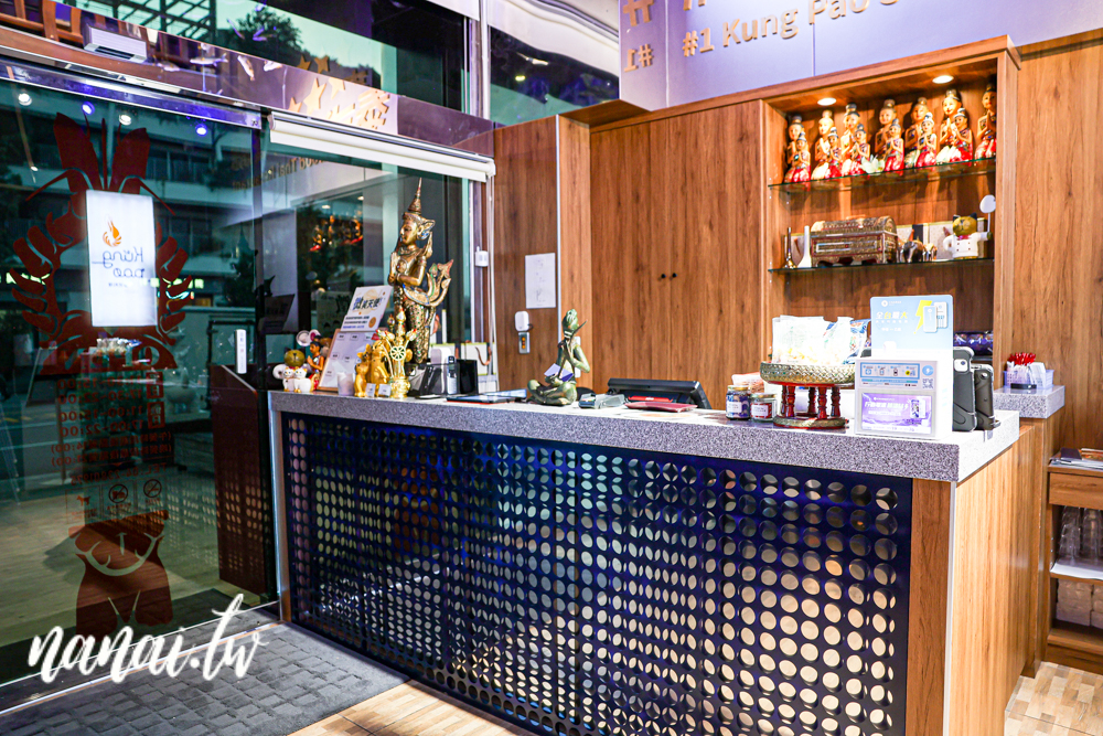 貢拋Seafood泰式海鮮餐廳在去年八月新開,由阿杜皇家泰式料理團隊打造,主打泰式海鮮料理,提供單點與套餐桌菜,選擇相當多元。廚師本身來自泰國東北,把家鄉的傳統風味帶到台灣,再依照在地口味做微調整,讓人能吃到道地又不失親切的泰式滋味。踏進店內,服務人員親切帶位,我們被安排在一樓座位區,旁邊是一整排巨蝦和魚,在藍色燈光映襯下,彷彿置身海底世界,氛圍相當特別。