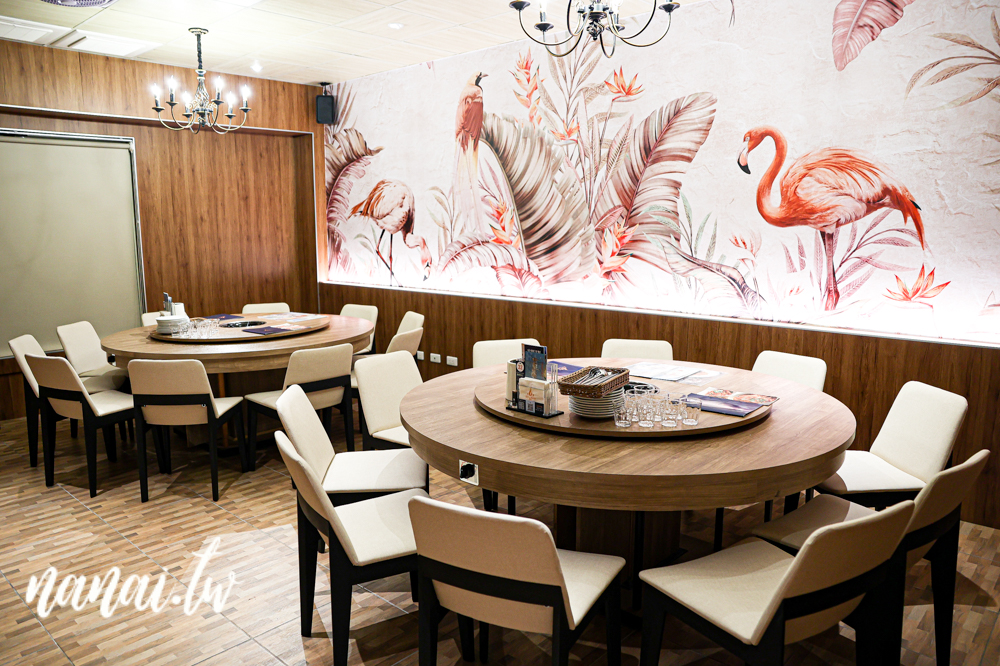 很喜歡二樓的包廂氛圍,獨立空間不會被外面打擾,想要安靜用餐可選這裡。裡面環境以鶴圖案為特色,搭配兩張大圓桌,可容納20人,很適合家庭慶生或公司聚餐!