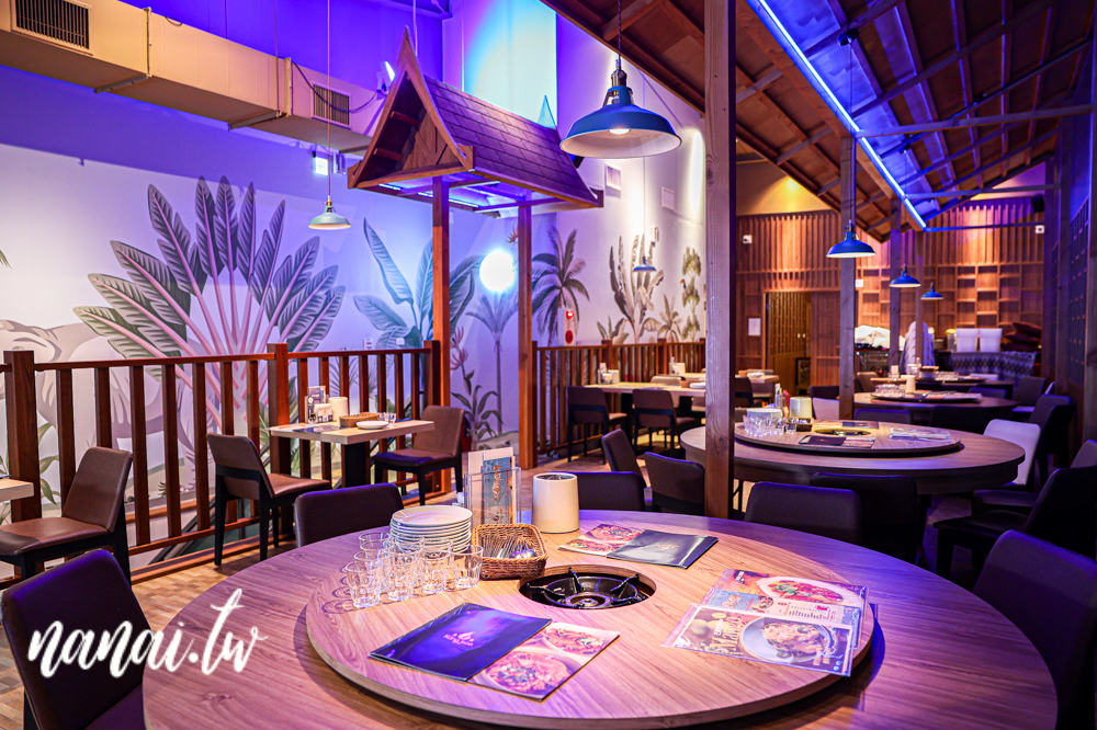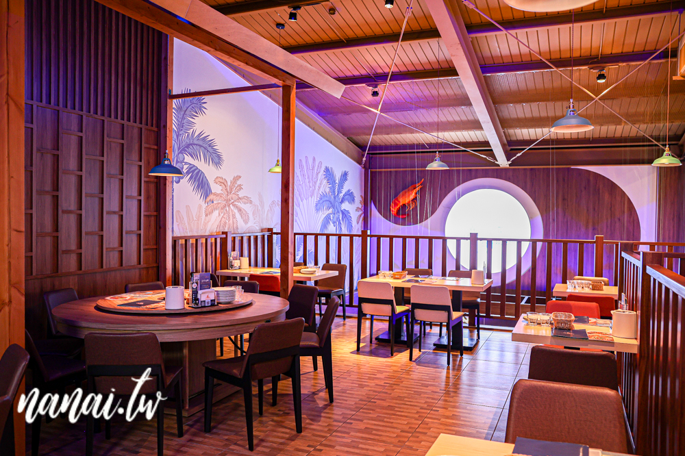 二樓用餐環境是木屋結合海洋風的設計,有四張四人桌、三張兩人桌,還有圓桌可選,座位選擇很豐富,無論是兩人小聚還是多人聚餐都很適合。