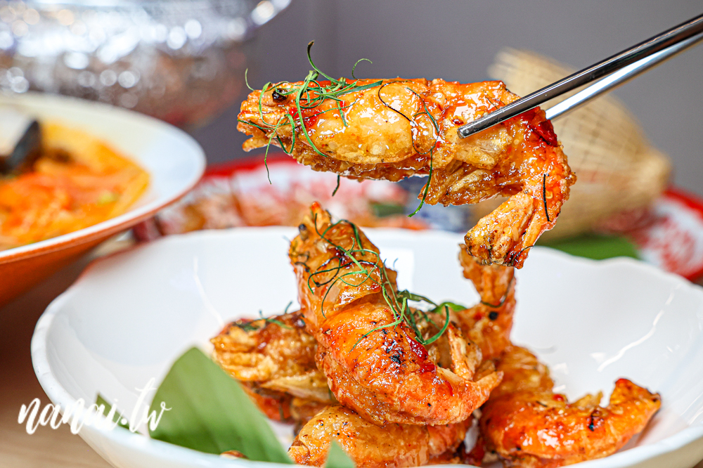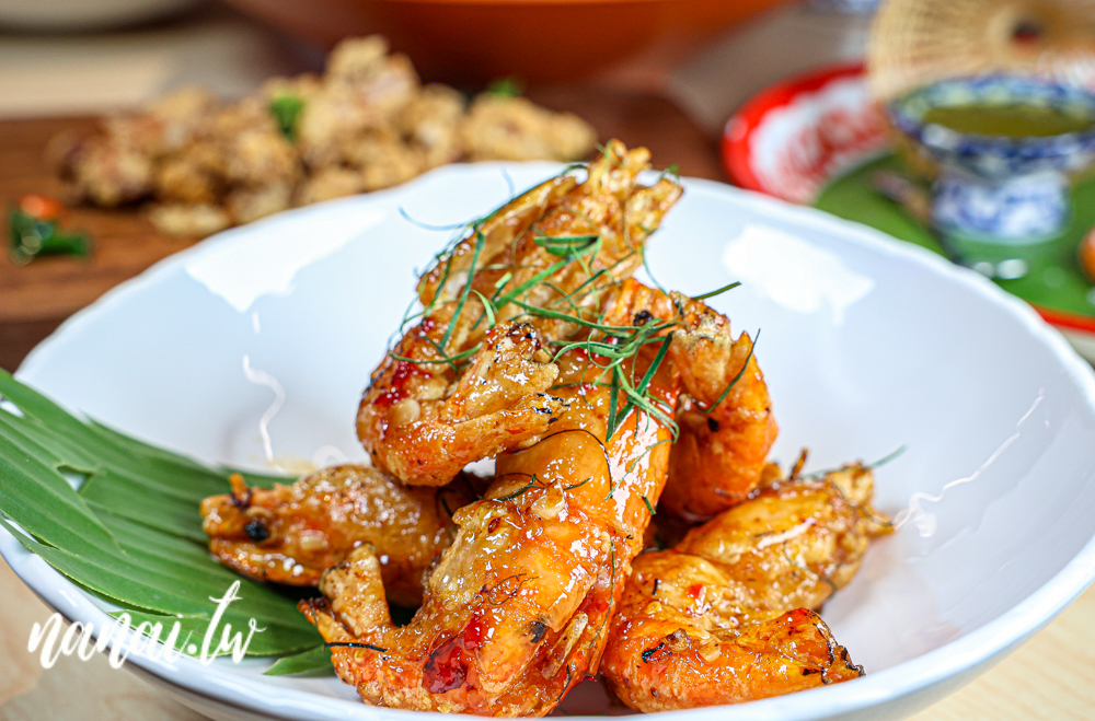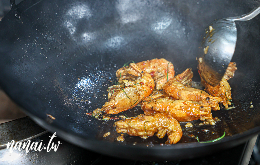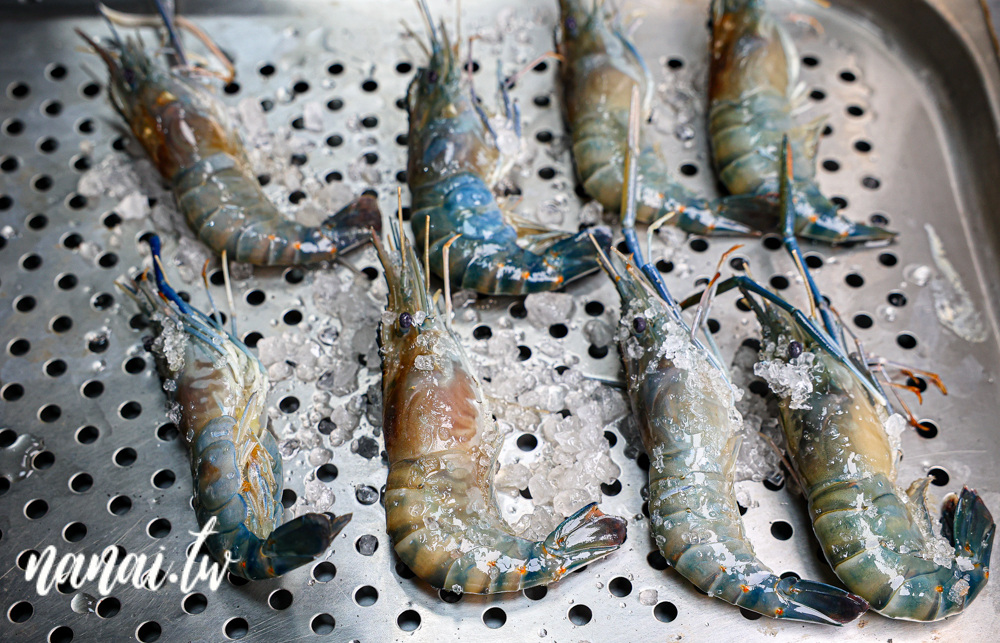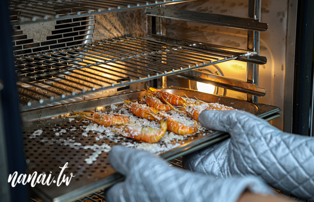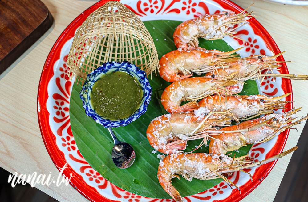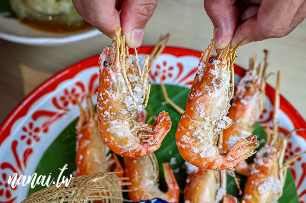 主角上桌!蝦控怎能錯過現撈泰國蝦~我們點了半斤招牌貢拋,一份380元,共有八尾,當天的蝦子都是新鮮母蝦,師傅先撒鹽巴,再放進進口特製烤箱以高溫烘烤,迫不期待想大口品嚐。