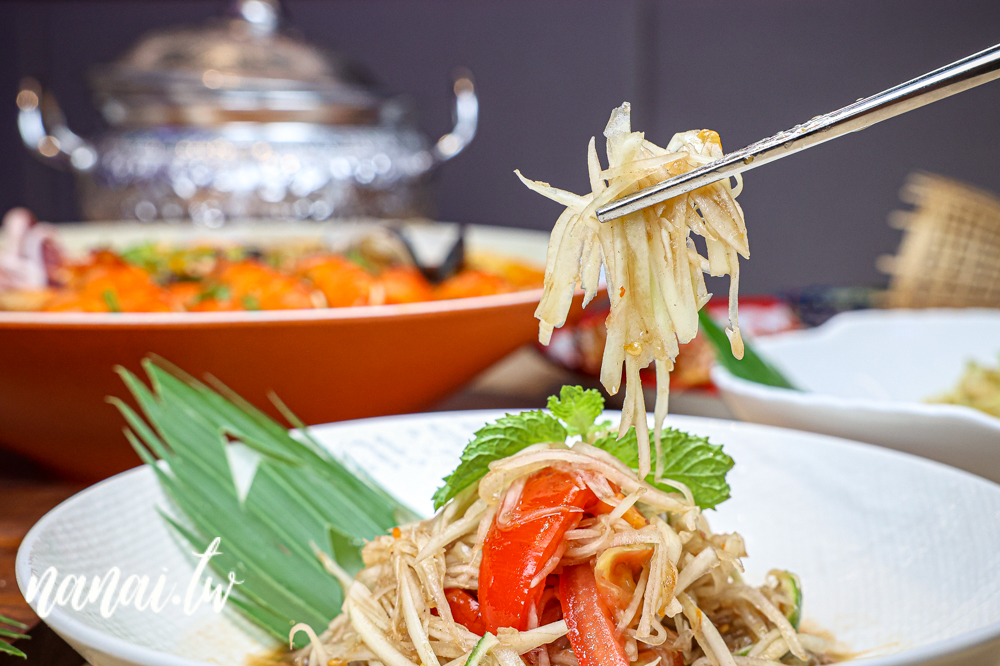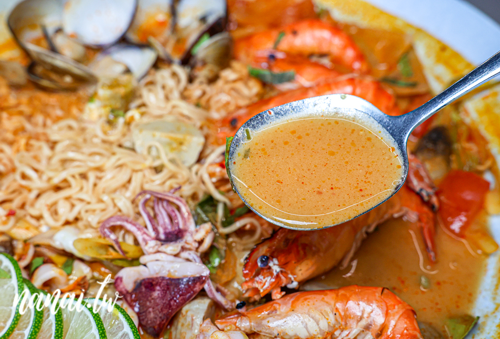 冬蔭功湯頭真的會忍不住一直喝,酸酸辣辣的滋味在嘴裡散開,還有海鮮的鮮甜與泰國香料檸檬葉、南薑、香茅的加持,整體味道很開胃,也很符合台灣人口味。
