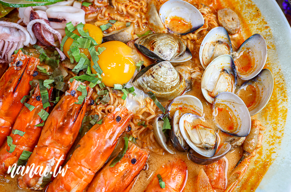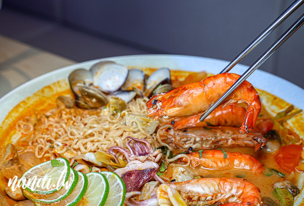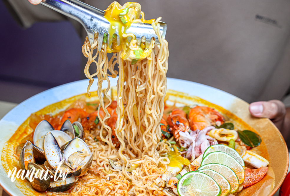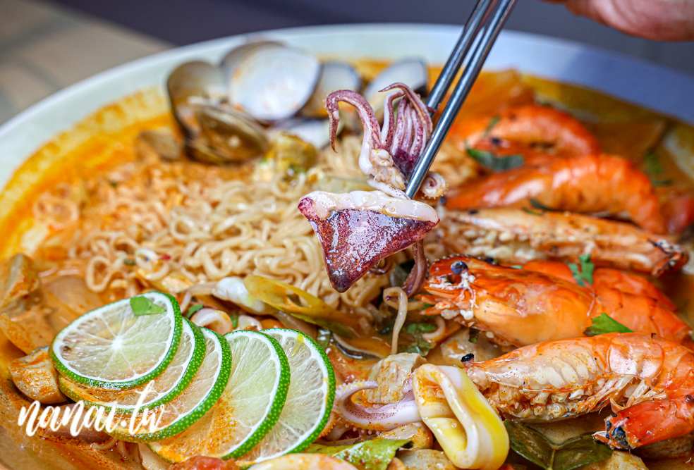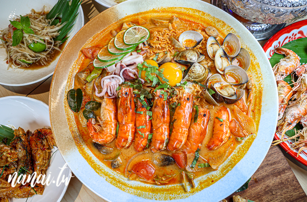 冬蔭功MAMA麵是貢拋的人氣王,一上桌真的會被份量嚇到,目測超過兩個手掌大,一碗2~3人吃剛剛好,裡頭有七尾泰國蝦、蛤蜊、中卷、兩顆生雞蛋,還加了兩包MAMA麵,最後用酸辣開胃的冬蔭鍋湯頭收尾。因為每天數量有限,常常晚餐前就賣完,想吃建議先預訂才保險。