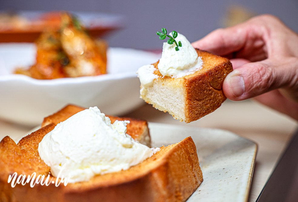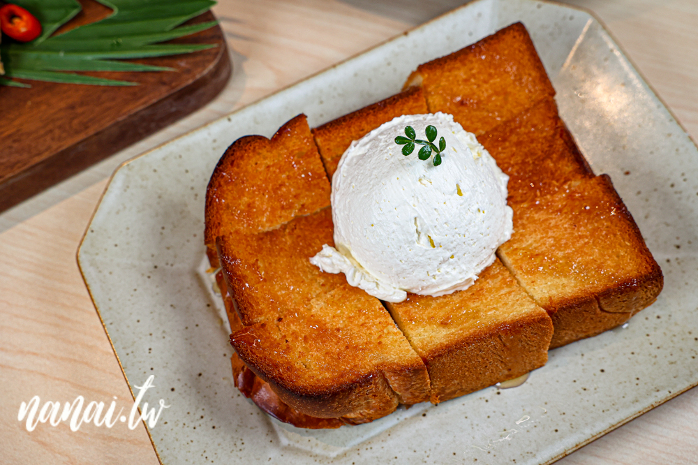 飯後當然要來份甜點收尾,我們點了超人氣的卡農邦(蜂蜜奶油),一上桌就被那球白皙的鮮奶油吸引目光。奶油打得細緻滑順,入口綿密、輕盈不膩,奶香在嘴裡慢慢化開好迷人,再搭配烤得外酥內軟的厚吐司,焦香中帶著蜂蜜甜香,整體吃起來甜而不膩,好吃!