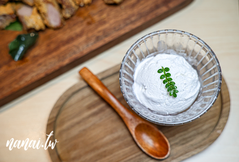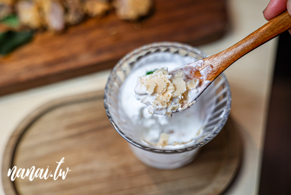 這道椰子冰淇淋好吃到瞬間秒殺!底層鋪上自己煎的椰香脆餅碎片,搭配純香椰奶冰淇淋,甜度剛剛好,吃起來層次豐富,涮嘴又不膩。