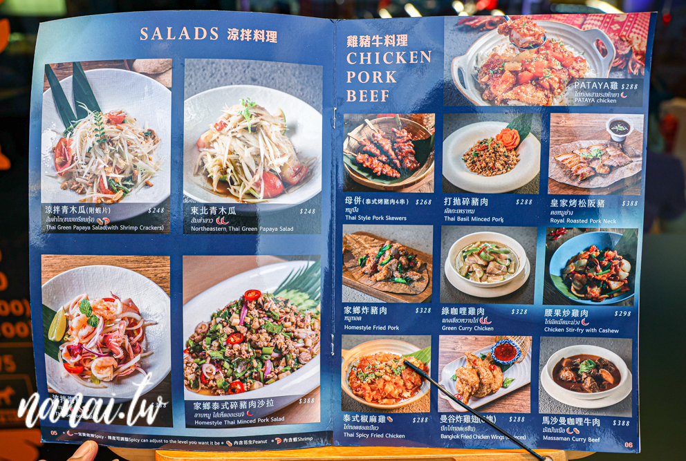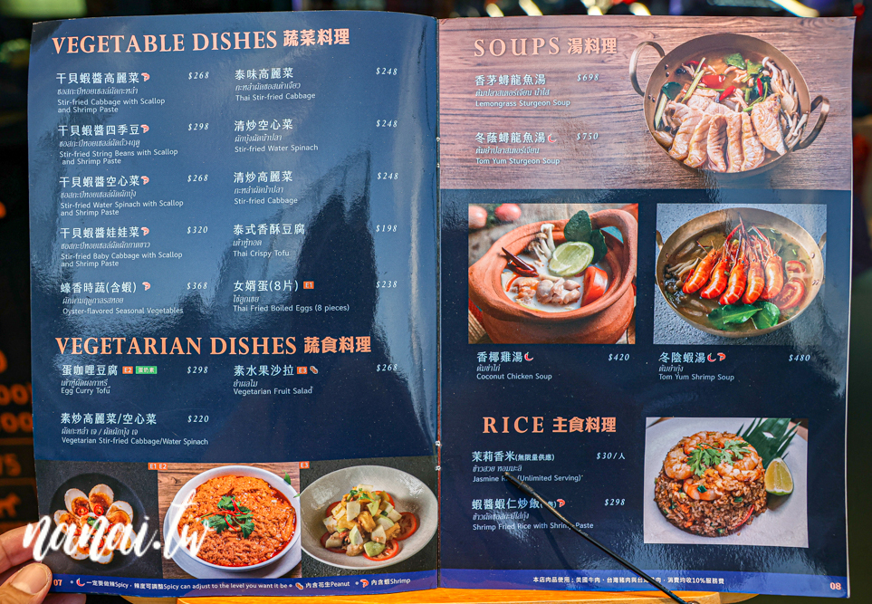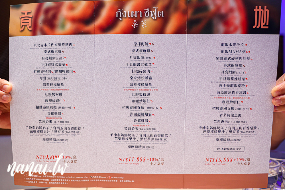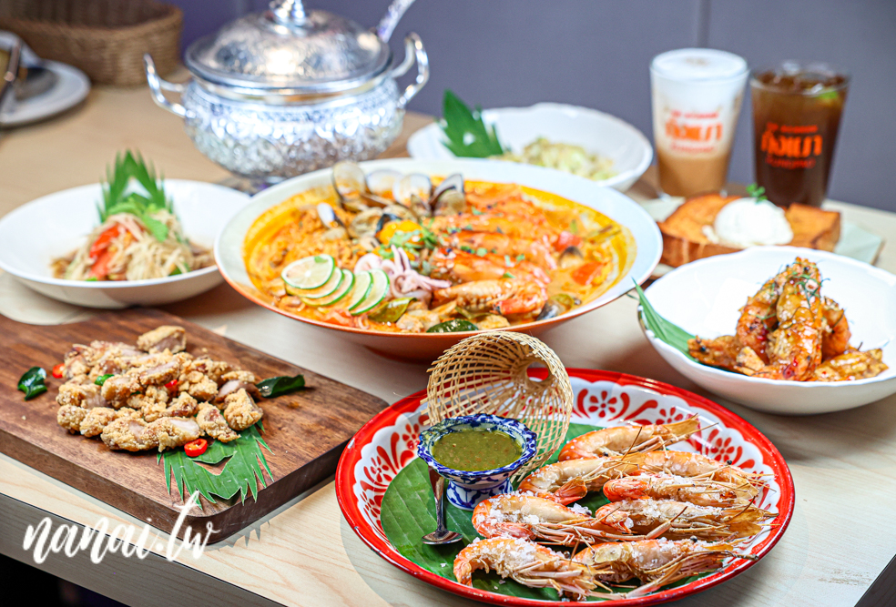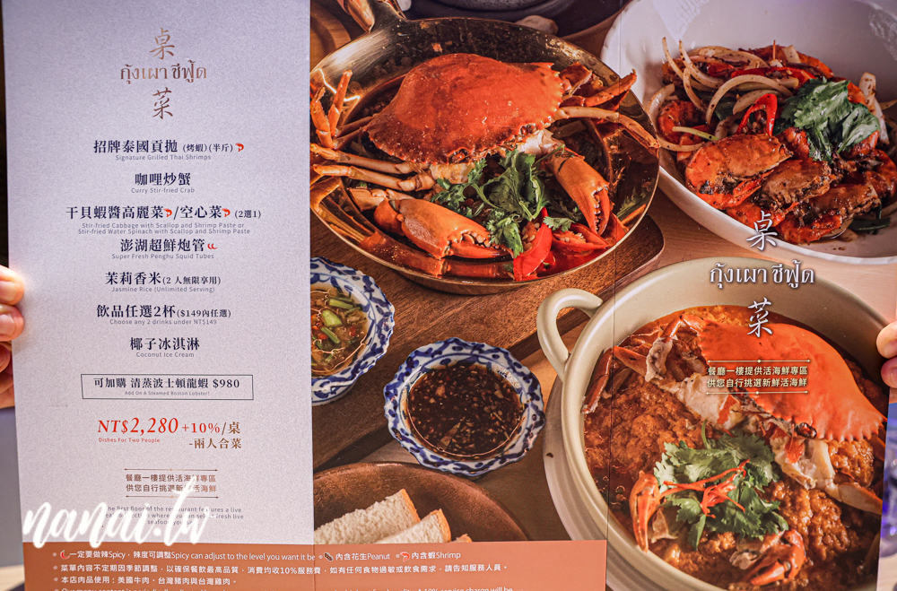 店家以泰式海鮮料理為特色,除了單點餐點,也提供套餐及桌菜選擇。招牌料理有泰國貢拋、檸香炒泰國蝦、三哥爆炒泰國蝦,以及經典的月亮蝦餅、波士頓龍蝦料理,還有各式涼拌小菜、雞豬牛料理、蔬菜料理、湯品、主食、甜點、飲料及酒類。