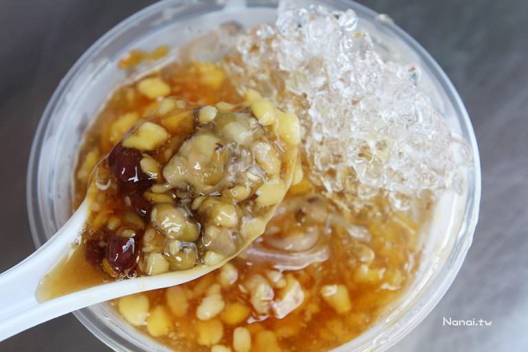 NANA點了一碗綜合吃看看,林媽媽將綠豆蒜端上桌,上層的小碎冰如此特別,據說有刀削冰之稱,同時也是特色之一,冰塊因為經過刀削,跟其它間的碎冰比較起來,變得很好入口,冰塊更是有一種晶瑩透亮的感覺,接著底層滿滿餡料有紅豆、粉條、Q粿、綠豆蒜,最後鋪上一層碎冰,與淋上林媽媽特製香醇濃郁麥芽焦糖在上面,香氣十分濃郁。