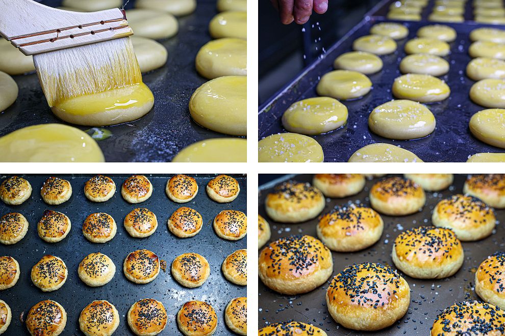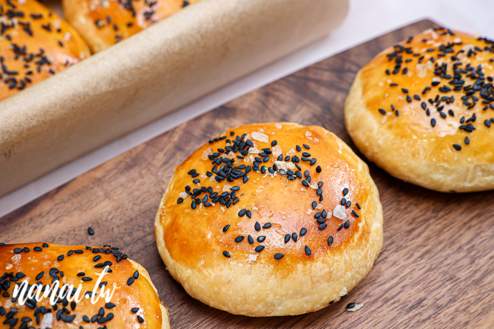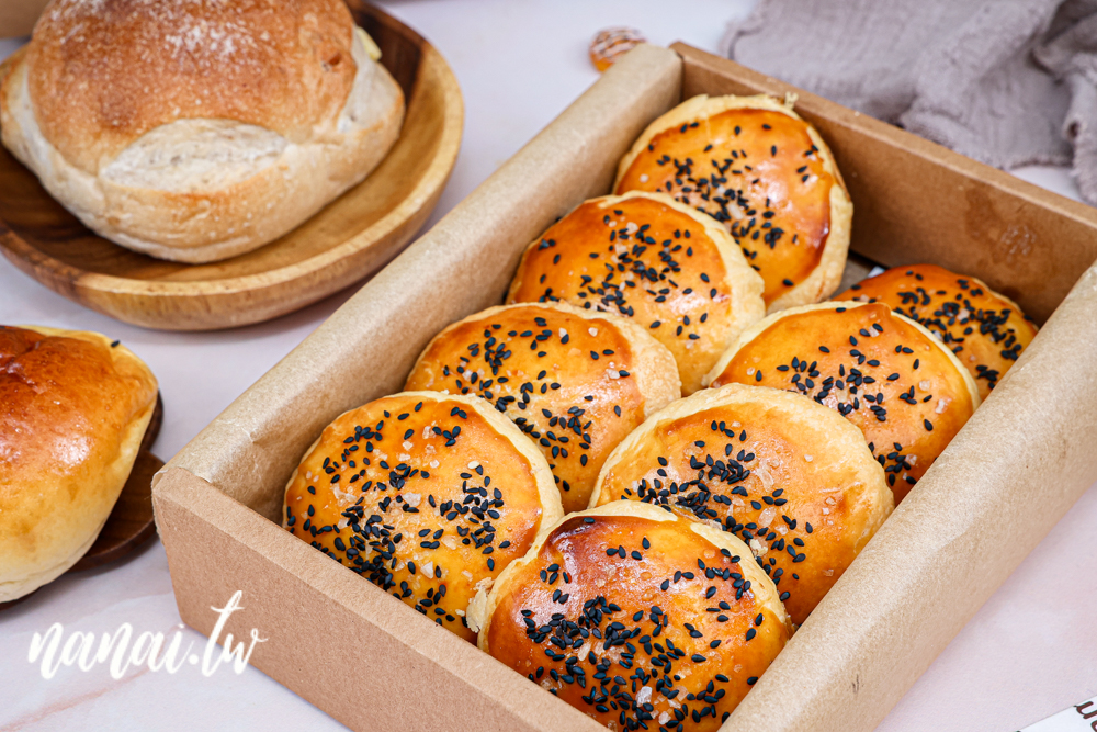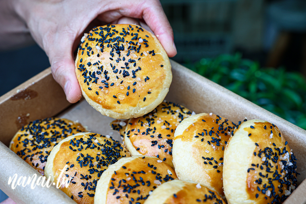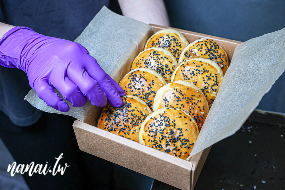 掀開盒蓋,香氣撲鼻的甜燒餅太迷人,每顆飽滿有份量,表面灑滿黑芝麻與法國鹽之花,光看就讓人食指大動。
