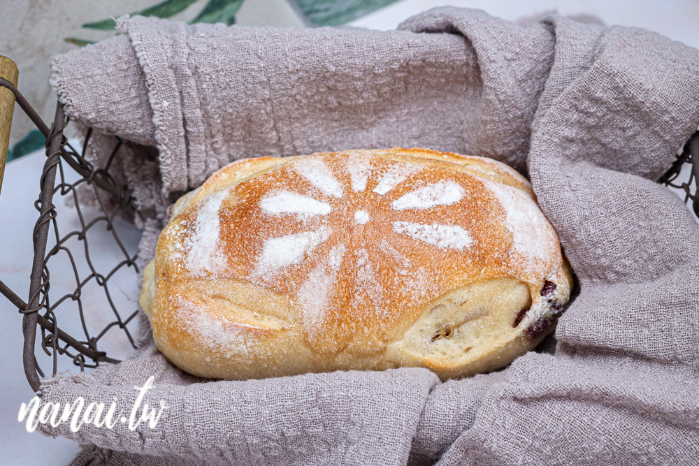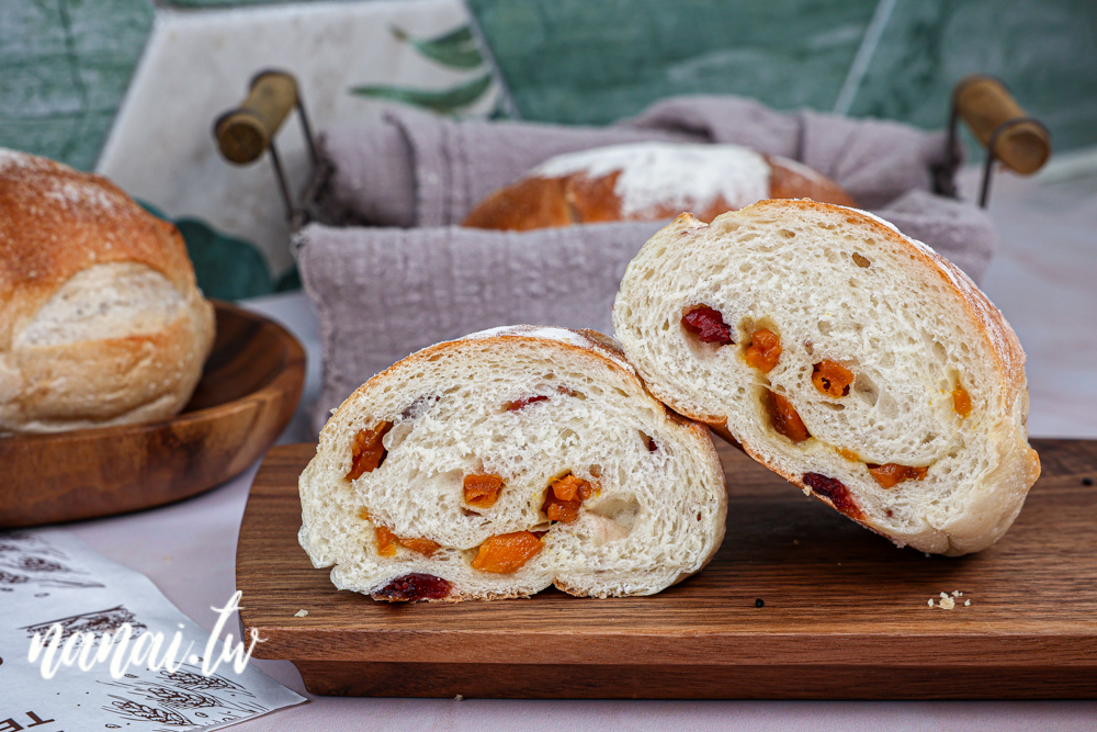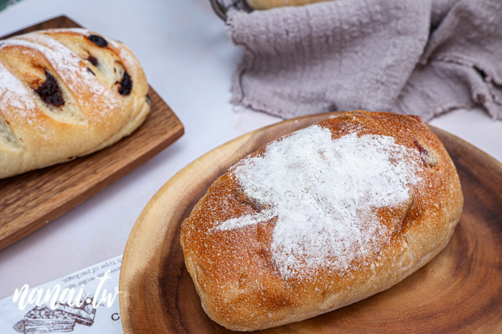 介紹完甜燒餅後,來試試店裡人氣超高的水果軟歐!這款麵包選用歐洲進口麵粉,並加入台灣芒果乾和上福蔓越莓乾,透過低溫長時間發酵烘烤,烤出來外皮微酥香,內裡柔軟有彈性,甜度不高,口感不油膩,帶著淡淡天然麥香,搭配酸甜適中的果乾,讓人愈嚼愈香,實在好吃!