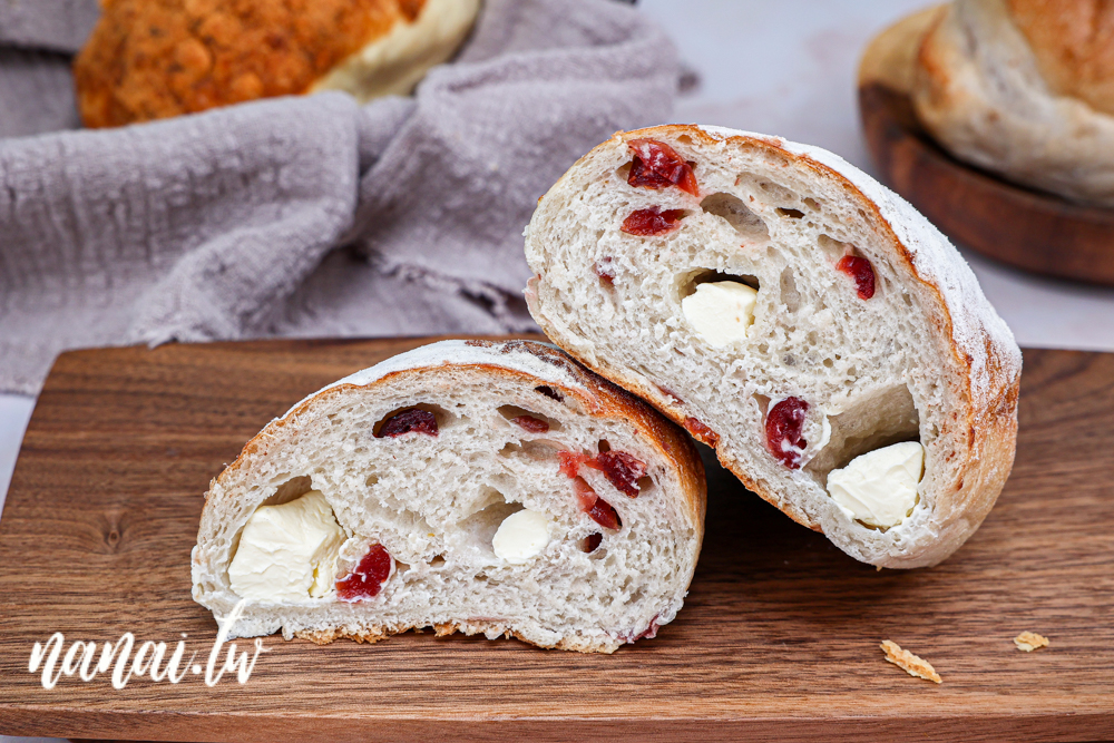 我好喜歡這款蔓越莓乳酪,內餡加了美國核桃、蔓越莓乾,還有澳洲乳酪,三者交織互不搶戲,尤其是那塊澳洲乳酪,奶香自然、微微鹹味,吃起來不膩,再加上蔓越莓的酸甜提味,整體口感圓潤又有層次,越吃越順口。
