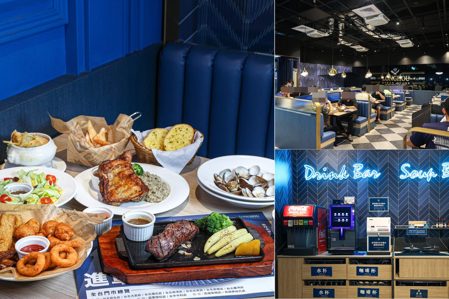 有著全台唯一英倫摩登美學風牛排館美譽,不僅以藍色系為主題,更將這裡打造成彷佛英國當地餐館,尤其加入大量工業風天花板,在運用藍色、黑色、金色線條等元素,整個室內環境給人一種低調又奢華的浪漫感。
