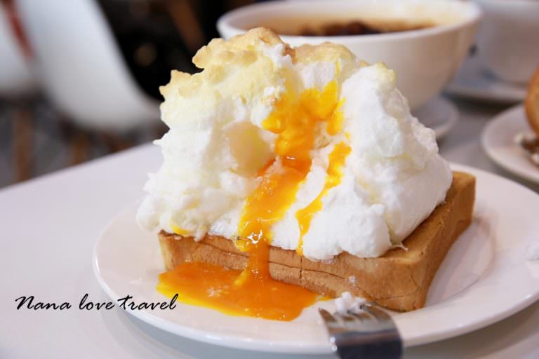 接著即將帶大家見證撥雲見日的快感,用刀叉輕輕的從中間畫下,半生熟的蛋黃就這樣緩緩流下,整個畫面讓人口水直流,阿斯~~這太犯規了啦! 吃起來的口感很特別,最下層的厚多士有塗上一層花生醬,在沾著蛋白霜與蛋液一起入口,嘴裡充滿著花生香,吃起來就沒那麼膩,挺有創意又好吃。