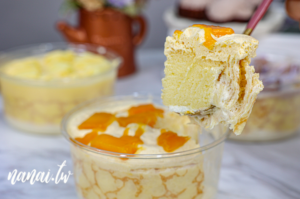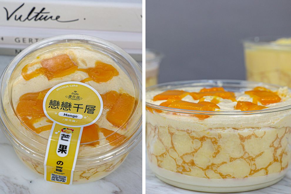 再來這顆戀戀千層芒果口味,連我阿母也超尬意~雖然和芋頭版一樣,使用千層蛋皮、日式鬆軟蛋糕體與滑順奶酪,不過最大亮點就在於芒果的果粒感,甜度會比芋頭稍高一些,芒果咬下的瞬間,清甜果香直接衝上來,根本是夏天的滋味~