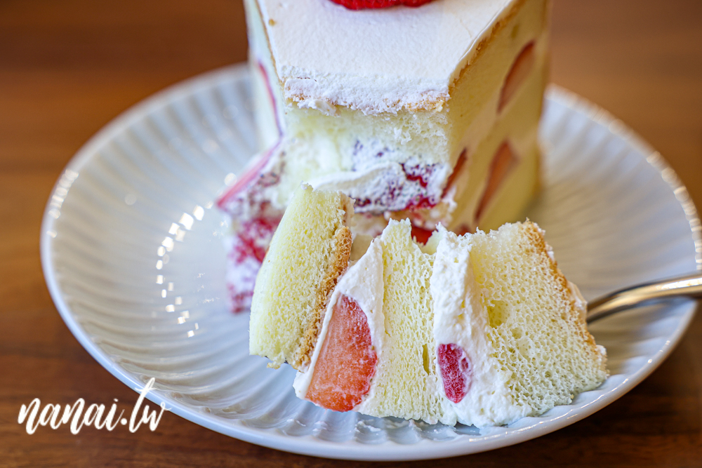 我們點了一塊草莓蛋糕,底層是香草蛋糕體,口感蓬鬆,內餡夾著雙層新鮮草莓,搭配使用動物性鮮奶油製作的滑順夾層,奶油不膩口,草莓則酸甜多汁,整體吃起來清爽又滿足。
