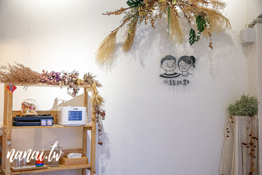 推開門~雙腳踏進心詩甜點,迎面而來的是簡約又帶點溫暖氛圍的裝潢。座位不多,大約只能容納16人左右,是個靜靜吃甜點、聊天放空的好地方。