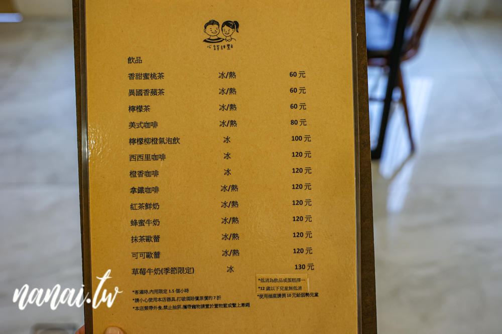 飲品選擇滿多的,有茶類、咖啡、氣泡飲、奶類、歐蕾,價格大約落在60~130元之間。最加分的是,低消只要一杯飲品或一塊蛋糕擇一就行,不強迫點飲料,這點我真的覺得很讚。