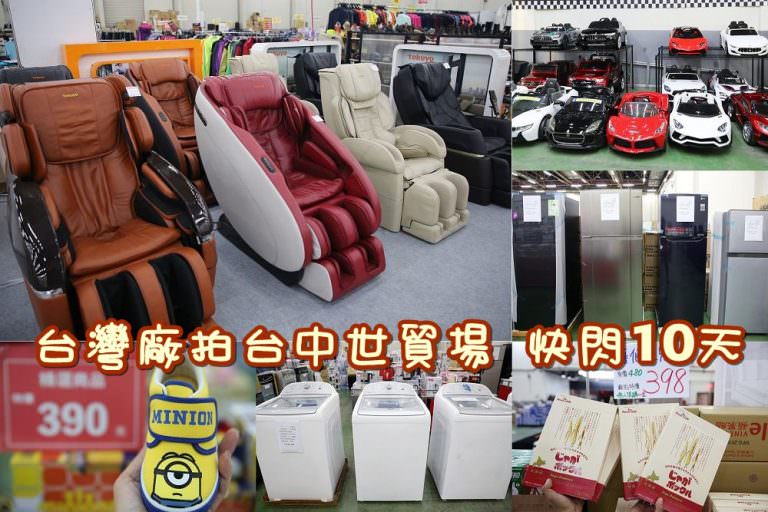 台灣廠拍移到台中世貿展覽館,超級快閃只有10天!台中秋季特賣超強卡司,中部首次展出TOKUYO蔡依林代言按摩椅、各大品牌大小家電,日立、東芝、奇美、SHARP、禾聯、惠而浦..等多款好康福利品甜甜價、原廠授權兒童超跑、日韓零食、小朋友玩具特賣、NIKE運動品牌、名牌服飾、晴天寶寶精品嬰兒用品、原木床具、華生叔叔授權玩、各種知名品牌聯合…等有十幾家廠商等你來逛,更酷是居然在廠拍也能看到日本知名零食「薯條三兄弟」,首3日凡在食品區消費即可用398購買薯條3兄弟一盒,每日現量50盒,售完為止。這檔滿滿誠意,超值優惠價格直接砍,就是要回饋給台中鄉親,台灣廠拍真心推薦超好挖寶!