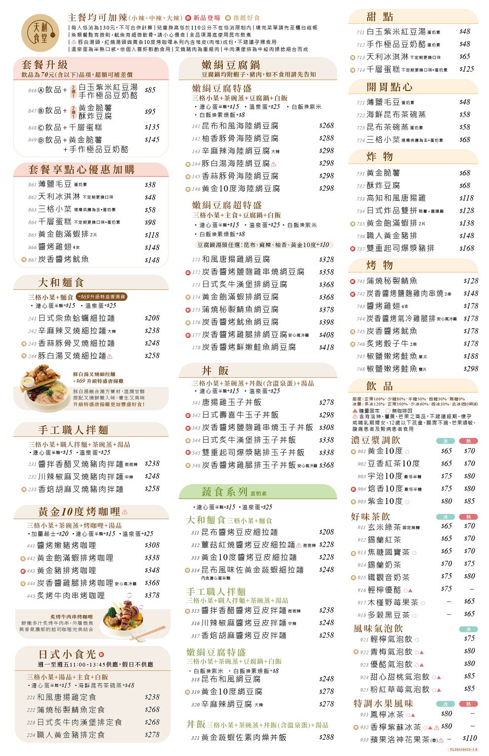 再來看看天利食堂的菜單,品項真的很豐富。從大和麵食、手工職人拌麵、黃金10度烤咖哩、嫩絹豆腐鍋、丼飯、蔬食系列、甜點、點心、炸物、烤物、飲品通通有,價格大約落在208元~418元之間,每人低消130元,而且無收一成服務費。另外也推薦直接升級套餐,比單點划算許多,還能吃得更豐富。天利食堂還會不定期推出新品,像我這次就是專程衝來嚐鮮,看這次又帶來什麼驚喜。