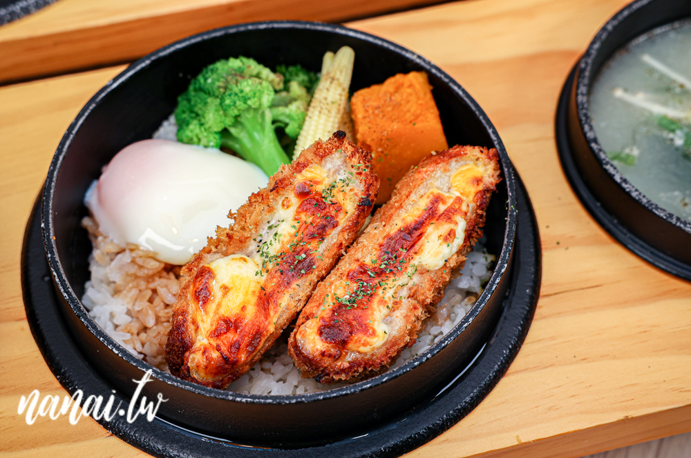 首先來介紹第一道新品雙重起司爆漿豬排玉子丼飯!一上桌就被濃濃的香氣吸引,真的是讓人口水直流。這道菜除了有三格小菜、茶碗蒸、湯品,還搭配了溫泉蛋丼飯,重頭戲則是雙重起司爆漿豬排,光是炸起來金黃模樣看了好誘人。