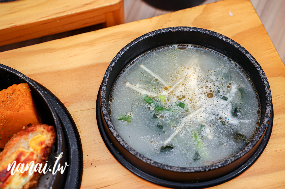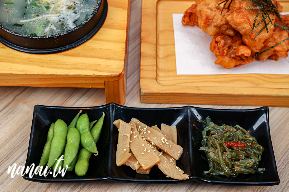 套餐還有附三格小菜,小菜都是隨機出餐。我們當天吃到的是毛豆、筍子跟海帶絲,風味不錯,好吃又開胃。