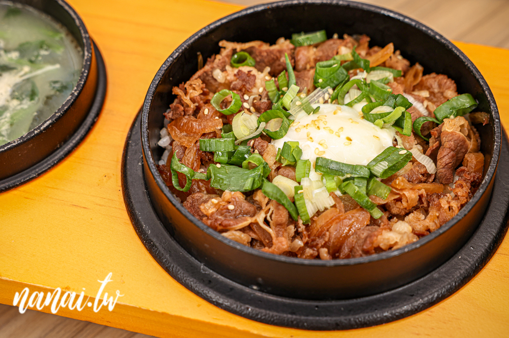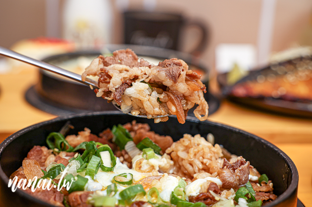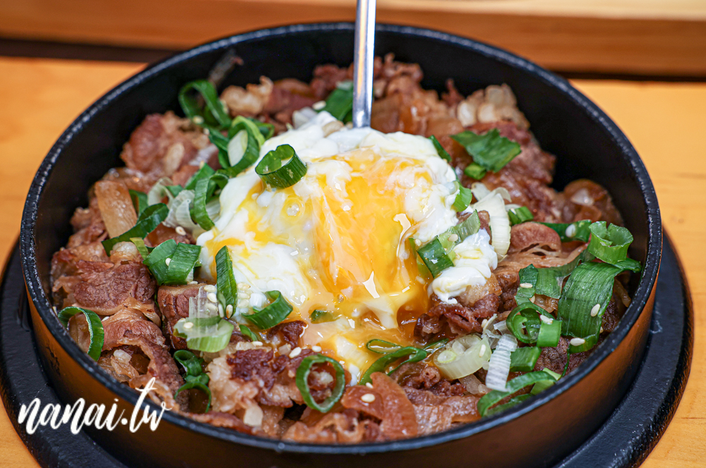 接著第二道亮點是日式壽喜牛玉子丼飯,先將牛五花和洋蔥一同炒香,再加入特製的日式壽喜燒醬汁,最後放在丼飯上,灑上蔥花與半熟溫泉蛋,讓人迫不期待想大口品嚐!