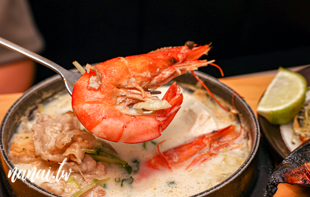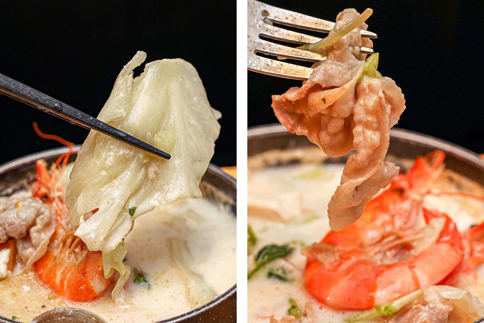 鍋裡內容物有兩尾蝦子、豬肉片、蛤蠣、豆腐、高麗菜、玉米筍、南瓜、豆皮等豐富配料。