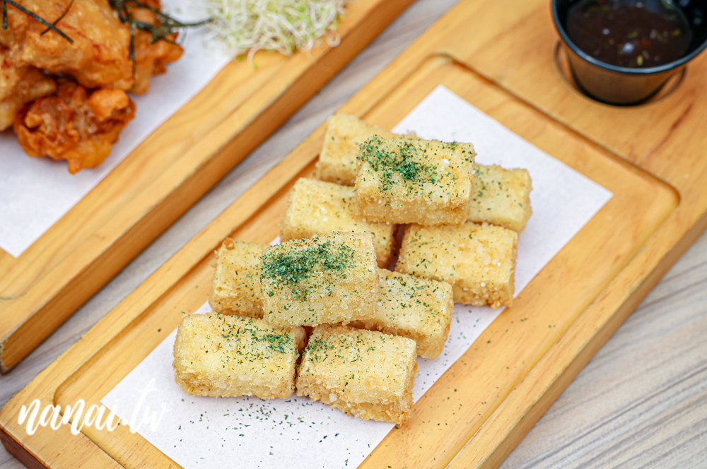 我們這次加了95元升級成B套餐,飲料可以選70元(含)以下的品項,超過補個差價就好,還能從黃金脆薯或酥炸豆腐二選一。當然要選人氣王酥炸豆腐,這道我每次來必點,外層裹粉下鍋炸至金黃酥香,一口咬下超有感,外皮微酥,裡面是燙口滑嫩的豆腐,再搭配蒜蓉醬,不誇張,我們三兩下就掃光。