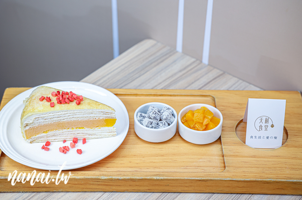 我們還忍不住加購了135元升級成C套餐!包含一杯70元飲品+一塊千層蛋糕,老實說這樣搭真的超划算!這次千層蛋糕是芒果口味,餅皮柔軟又濕潤,內餡還吃得到芒果果肉,酸甜清爽剛剛好,旁邊還附上黑糖麻糬和黃桃丁,整體甜度不會太高。