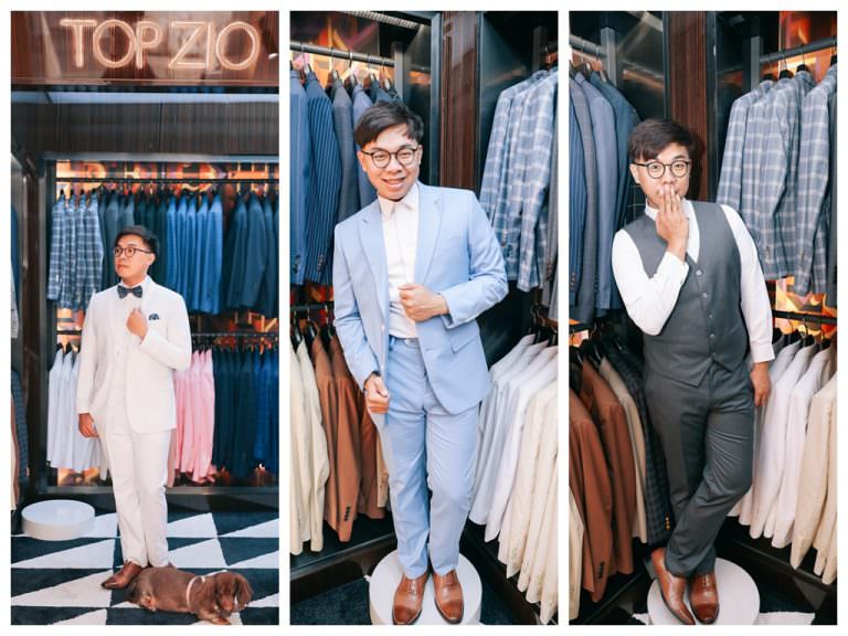 試完幾套後,很快速決定拍婚紗就是這套白西裝,確認後專業西服師會先檢視腰部、手臂、肩膀部分、褲管是否合身,若太長還是太寬都會現場幫你微修改做確認。