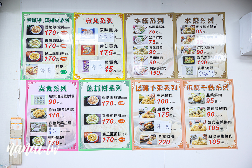 丸餃子熟食從中午11點一路開到晚上7點,中間不休息,對那種過了午餐時間才餓的人來說超方便。主打煎餃、水餃、素水餃、飯類、麵類、蔥抓餅、湯品、小菜..等,品項滿多的,而且不定時還會新增新菜色!像最近就多了白切三層肉和肝連肉,價位從20元到145元之間,價格也算親民。