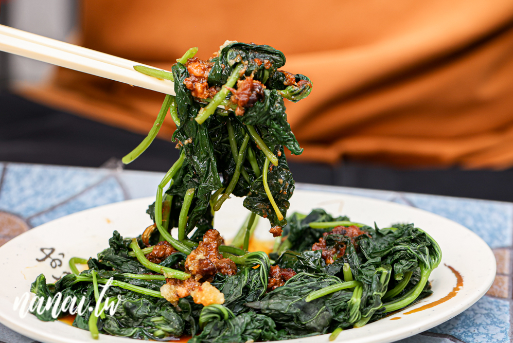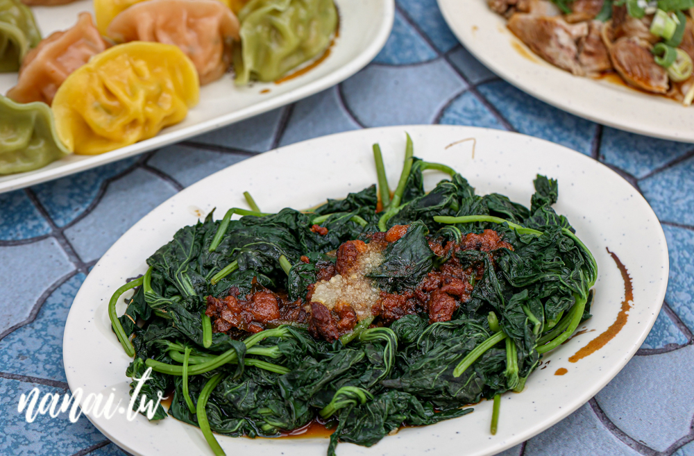 店裡的地瓜葉是自家栽種的,淋上香氣逼人的肉燥和蒜末後拌一拌,大口咬下去,鮮嫩中帶點脆感,完全沒有苦味,簡單川燙就很好吃!